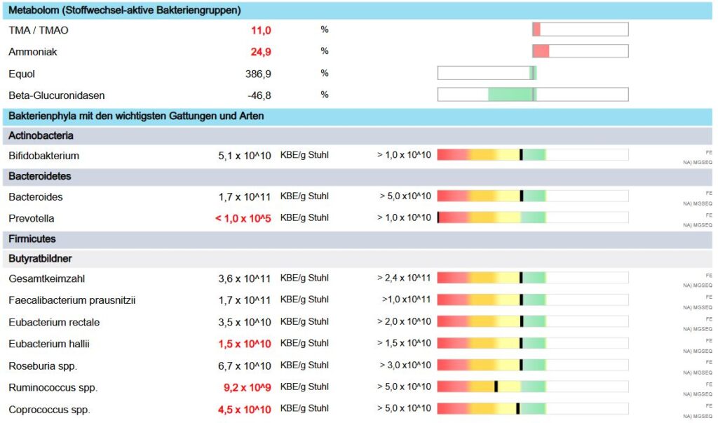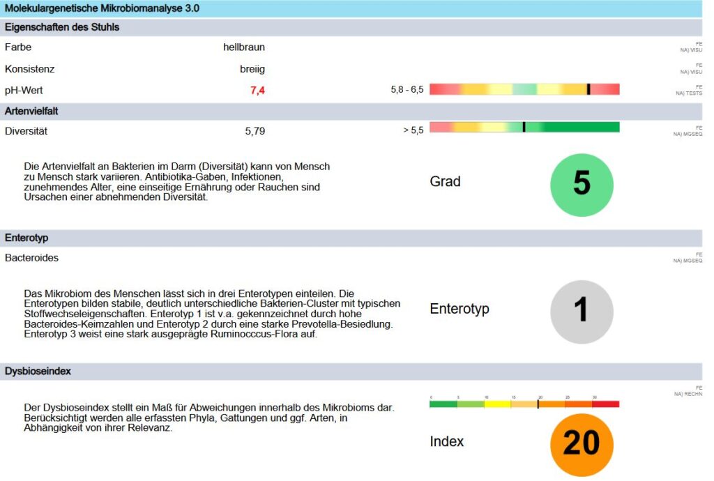 Wir können den Darm in seiner Funktion sehr gut unterstützen. Die Grundlage bildet dazu eine laborgestütze Analyse, die alle wichtigen Parameter anzeigt. Dazu gehören die Verteilung der Bakterien auf verschiedene Spezies und ihre Anzahl. Blick auf die Pilze im Darm, Verdauungsleistung von Pankreas und Galle, Verdauungsrückstände im Stuhl, schlussendlich die Entzündungsmarker und das Immunsystem.